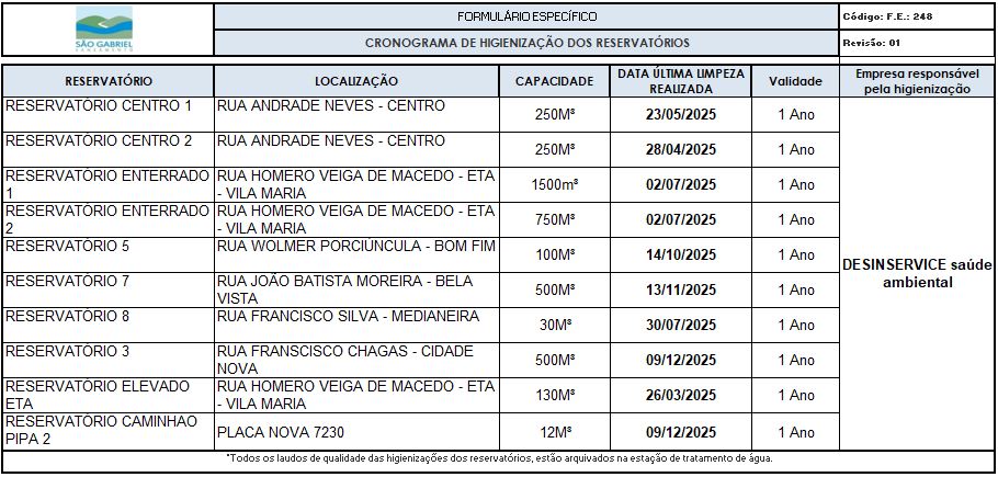 Para complementar o controle de qualidade, periodicamente é realizado a limpeza e desinfecção dos reservatórios que armazenam a água tratada a fim de assegurar as condições sanitárias necessárias para preservar os padrões de qualidade da água armazenada. Em atendimento ao Decreto Federal 5.440/2005, abaixo estão disponibilizados para consulta pública os registros atualizados de controle e qualidade da água, bem como, histórico de higienização dos reservatório.